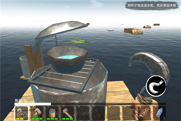 5、最后来到游戏中,在无垠的海面上展开自己的冒险,通过手中的钩子收集有用的物资生成下去。