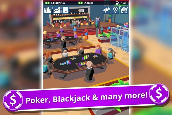 空闲赌场经理是一款模拟经营类手游,在游戏中玩家将成为一名赌场老板,为了避免赌场面临破产的结局,玩家需要力挽狂澜,从一家小赌场开始,不断更新设备,吸引客人光临,并在赚取一定金钱后,继续拓展赌场,让赌场变得更大,且还能升级设备,以赚取更多财富!