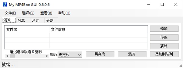3、加入文件之后(至少2个),用户可自定义调整延迟通道(防止混音),然后点击“混合”按钮,My MP4Box GUI将会自动处理,完成之后点击“保存为…”按钮可输出结果!