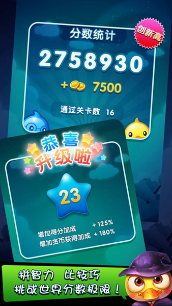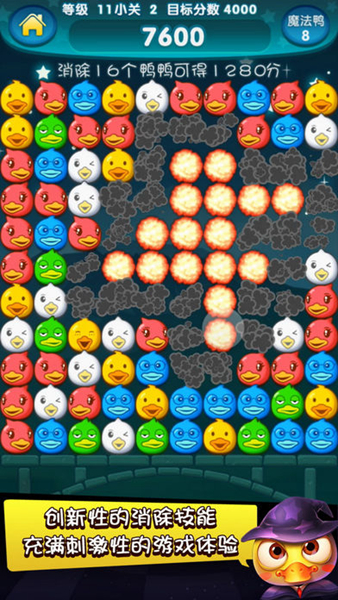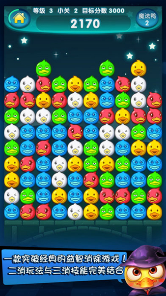 魔幻鸭是一款创新的休闲益智游戏,游戏首次将二消玩法和三消技能完美结合。精美的画面和欢快的音乐给你视觉和听觉上的极致享受!