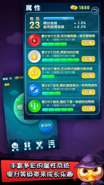 魔幻鸭拥有炸弹、变色、掉落、双倍和附加分等5种技能。技能的等级不同,威力也不一样噢。