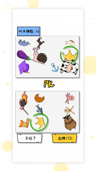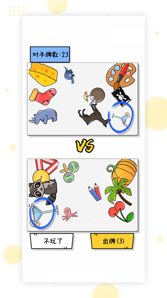 一起来找茬游戏是一款非常有趣的益智对战类手游,玩法非常新颖,和传统的找茬游戏不同,这款游戏采用在线实时竞技玩法。每个玩家都有自己的卡牌池,谁先找出相同图案,谁就赢得对方卡牌。卡牌在对局中是随机位置摆放的,并且会可能出现小部分重叠,因此非常考验玩家的反应和观察力。玩家可以随时停止对局和切换对手,同时还能将对局进行分享。游戏特色