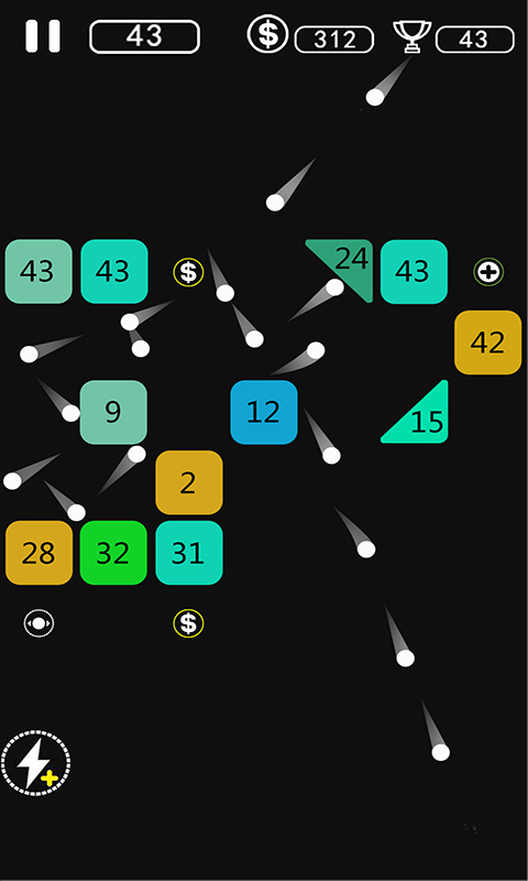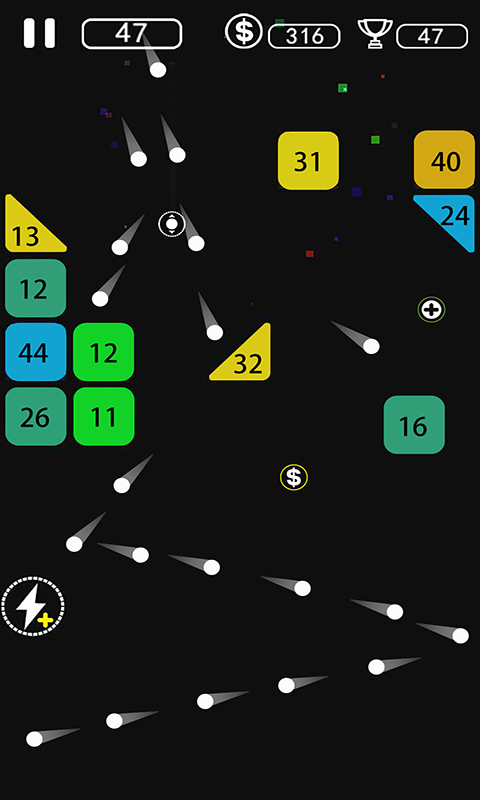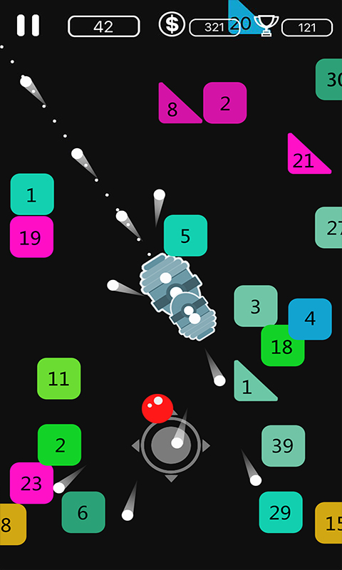 虽然炮台的子弹能打倒砖块,但是砖块可是源源不断出现的,你需要调整好炮台发射的方向,使打到砖块后弹射的子弹尽可能的弹到更多的砖块上,就像电视剧里的弹跳弹,超炫的有木有!除了调整弹射角度,游戏中还有很多实用道具,用子弹打掉道具就能获得特殊能力哦,都是让你打倒砖块的神器,利用好的话不仅能保命,还能快速清场,让你坚持的更久!