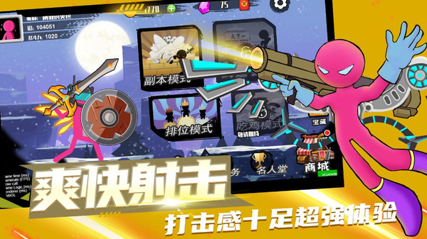 火柴人射手破解版是一款非常爽快的火柴人射击对战类手机游戏,这里有超多武器可以选择使用,每种武器都有独特的攻击效果和造型。玩家可以选择闯关冒险,和多名敌人进行作战,同时也可以和其他玩家进行对战。游戏中的武器攻击都是需要瞄准的,并且都是采用抛物线的攻击方式,很讲究技术,当然在操作上已经针对手机进行优化,能够轻松地进行控制。游戏介绍