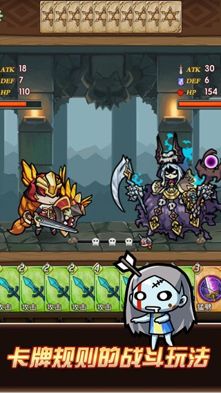 每次战斗前我们都会获得九张卡牌(随机发放的),每张卡牌的左上角都有个数字,代表着这个卡牌的大小,然后我们点击三张卡牌后选择出战,就会和对方的卡牌比大小,谁赢了就谁出手攻击,也就是你只要一直赢就可以一直攻击,直到干掉对手。每次攻击过后系统会再随机给我们三张卡牌把我们的卡牌数补充到九张。