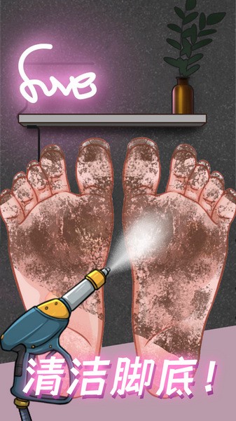 2、解压清洁玩法:拆卸顾客的脏污鞋袜,用高压水枪冲洗脚缝,将混乱的甲油瓶排列整齐,完成每个清洁步骤可获得动态评分。
