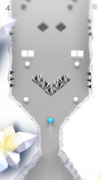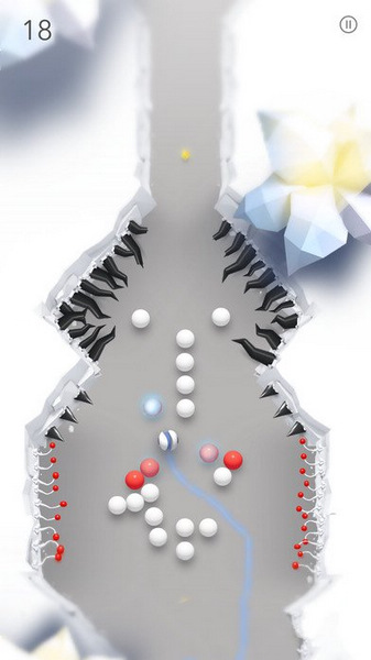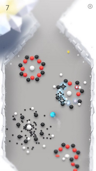 这款游戏色彩大概只存在于几种不同的小球上,余下的全是灰白相间的场景。玩家将以划屏的方式控制蓝色小球在场景中前行,一路上玩家将会遇到人畜无害的白球,一碰即死的黑球,延迟爆破的红球,看上去熙熙攘攘好不热闹,实际上常常根本来不及反应就被误伤Game Over。