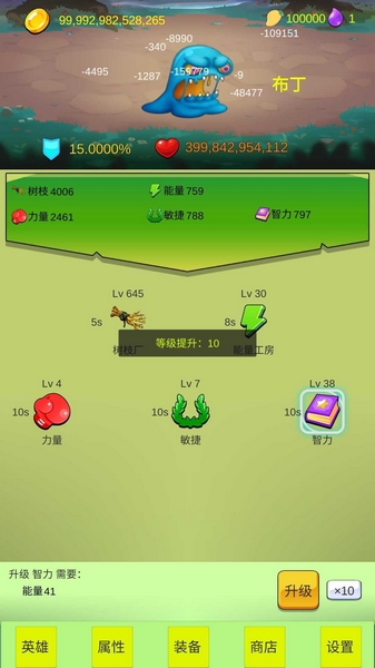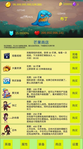 1、购买英雄、升级英雄技能、购买装备和属性,挑战不断增强的Boss。