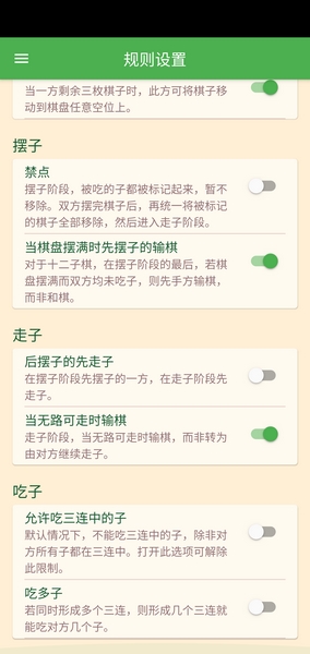 游戏的核心玩法是轮流放棋子,当一方连成一线(“三连”)就可以吃掉对方的棋子。游戏结束的条件是某方无法移动棋子或者盘面上剩下的棋子太少。这个过程可能会出现循环的情况,导致和棋,这也让游戏更有意思。