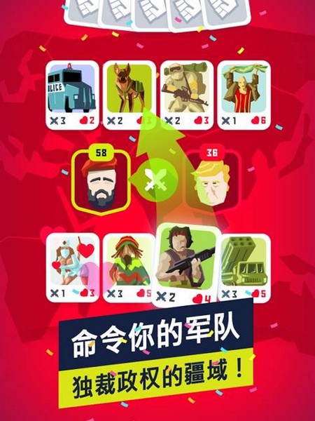 由Tigrido开发的一款策略卡牌类游戏,你是一支民主党派的新任领导人,握有无尽的权利,你必须发动策略性的战争击败他们,并清除一切障碍。游戏以经典的卡牌对战方式进行,充分考验玩家的决策能力,每一次的交锋都可能决定胜负。