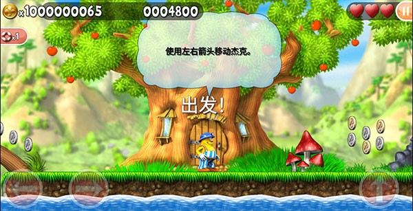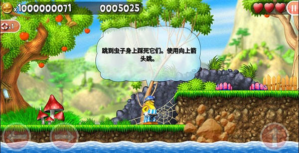 1、左边的两个按键分别控制前进和后退,右边的按键控制跳跃,按两下则是二段跳,杰克有3颗爱心,碰到虫子等怪物会消耗爱心;