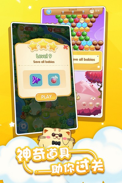 欢快、轻松的背景音乐和可爱的音效,如泡泡消除的音效、猫咪的叫声等,增强了游戏的趣味性和沉浸感。