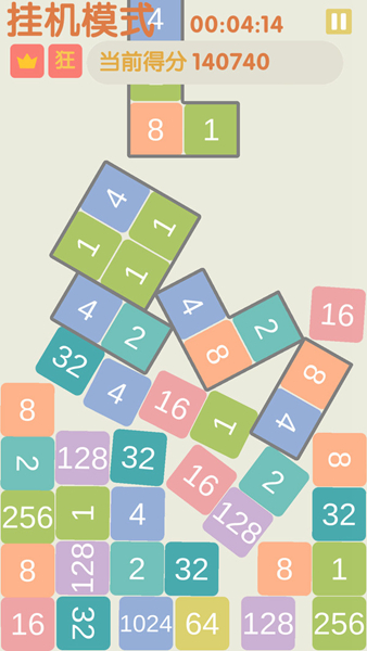 挂机模式:这可能是游戏最好玩的模式,能够让你紧盯屏幕10分钟甚至一小时无法自拔,就挂在那里看方块自己落下、合成、爆炸,分数↑↑↑而且挂机模式退出还可以续玩,永远不会结束,双击屏幕可以让方块砸下,比较人性化。