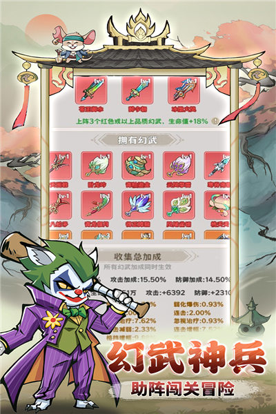 幻武,神兵利器,佩戴后可以增加人物的属性,提高战斗力。每种幻武都有自己的特性技能,跟智囊有着部分相同的效果。但是幻武的加成更直接,可以直接加成到主角上,在进行攻击的同时即会发挥特性效果。幻武激活越多,获得效果越多。可以根据不同的流派搭配不同的技能,就能得到不一样的体验感。