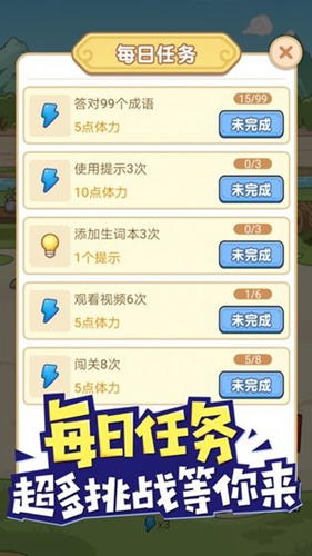 3、充满挑战性的游戏玩法,而且玩家还可以随时随地的去进行挑战,运用自己的成语积累量去完成挑战。
