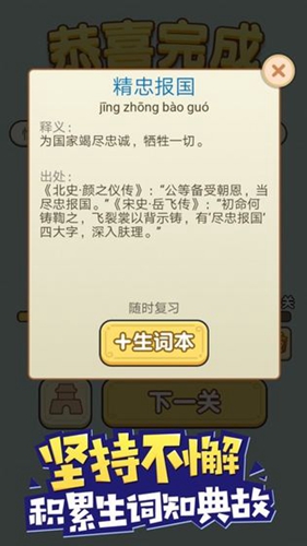 3、在完成一个关卡的挑战后玩家们可以对关卡中你感兴趣的成语进行了解。