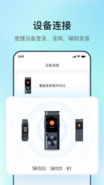 蓝牙连接讯飞智能录音笔设备,辅助进行账号登录、网络连接,操作便捷