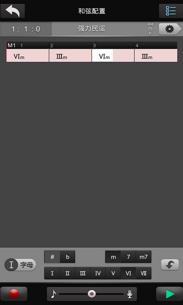 这些罗马数字表示的是该小节配置的和弦。Ⅰ就是代表的1级和弦,也就是135。Ⅱ就是代表的2级和弦,也就是246。依次类推。用户可以对这些和弦按自己的方式去修改它,从而获得不同的音响效果。