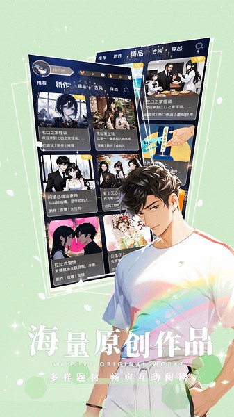 海量原创作品实时更新,众多分类任你选择:古风玄幻类、都市言情类、穿越宫斗类、架空类、现代明星类、悬疑推理类等互动小说。