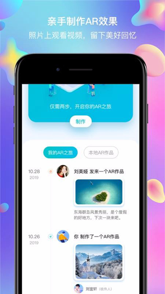 软件功能超多,除了基本的视频上传和管理,还能制作各种有意思的AR内容,比如宝宝成长相册、旅行手账,甚至还能做魔性短视频。特别是能把普通明信片变成AR互动卡片,这种方式真的很有新意!