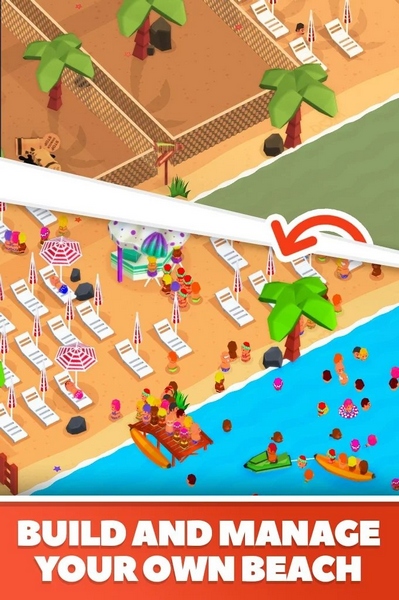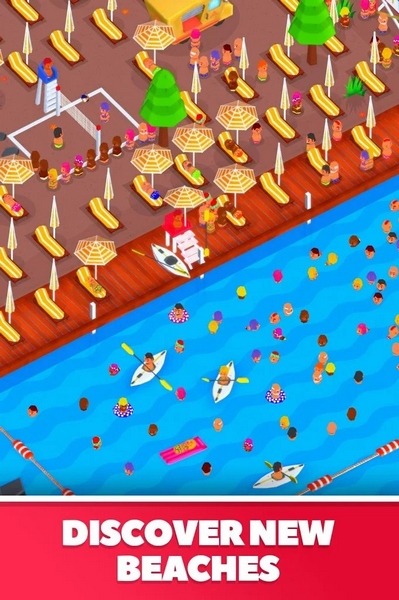 游戏玩法非常自由,你可以建造酒店、咖啡馆、商店等设施吸引顾客。为了让海滩更有趣,你需要不断升级设施,比如滑梯、蹦床和独木舟,让游客玩得开心,花更多钱。同时别忘了救生员的重要性,如果有人淹死,其他游客可能会离开。