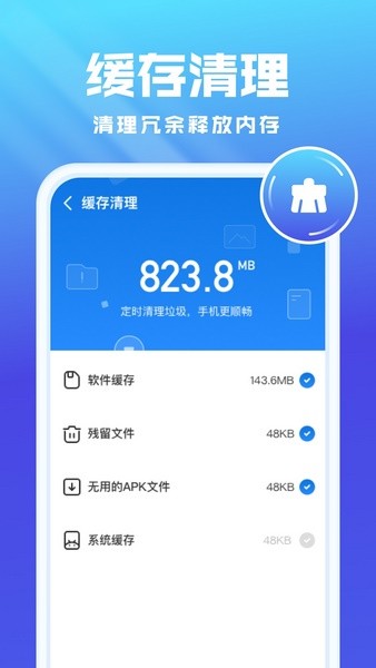 3.可以一键快速清除各种手机缓存垃圾,让手机运行更给力。