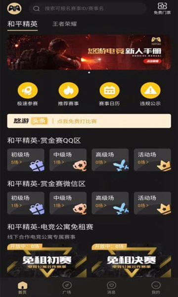 1、下载安装悠游电竞app,使用手机号注册打开软件,来到首页;