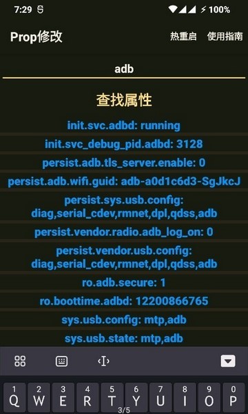 注:本APP中提供的“热重启”按钮将会重启四大进程:zygote、netd、zygote_secondary,以保证99%的属性都会在热重启后生效。但如果你修改了冷门属性,如adbd相关属性,那么热重启后是不会生效的,因为adbd进程并没被重启。解决办法也简单,去设置里面改动一下USB连接选项就会自动重启adbd进程了。