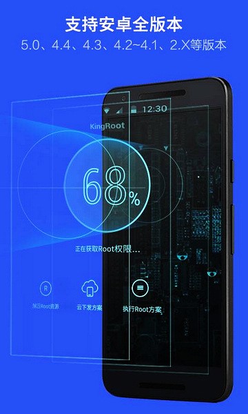 KingRoot是一款专业的root权限管理器,可以帮助用户卸载手机里那些没法删掉的系统软件,释放内存空间。它还能防御病毒入侵,并提醒危险情况,防止恶意软件相互唤醒,让手机运行得更快。