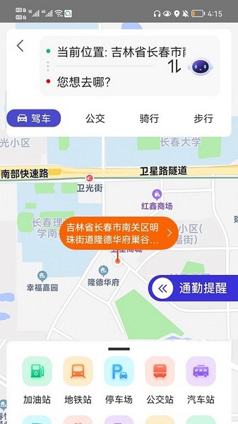 提供驾车、公交、骑行、步行等出行方式的导航路线;并根据用户设置的上班行程,提供通勤提醒