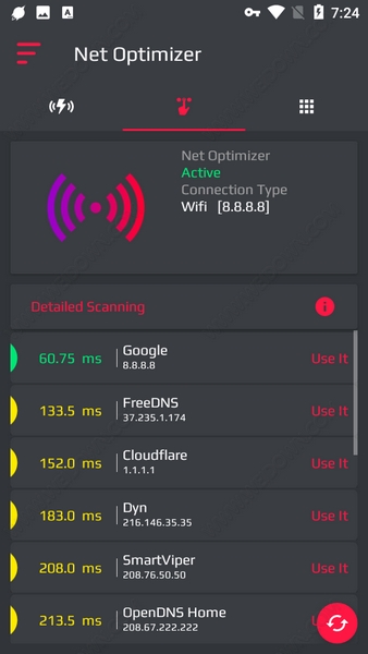 Net Optimizer Pro是一款可以将网络进行智能优化的手机APP,该版本为专业破解版,下载安装后可以直接使用高级功能。软件的用法非常简单,只需一键点击就会自动搜索DNS,然后在结果列表中会显示每个DNS的信息以及速度,我们只需要点击就能进行切换。通过此方法可用让我们的网络速度最大化,同时还能解决一些因DNS导致的网络问题。