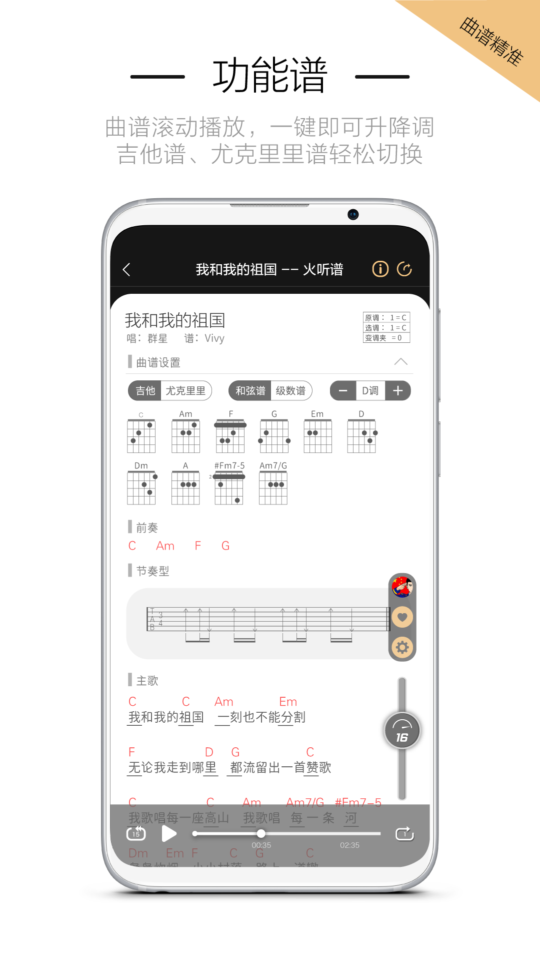 曲谱自动播放、和弦简化、切换为和弦级数谱,升降调功能(用户可根据自身技术水平调整曲谱难度)