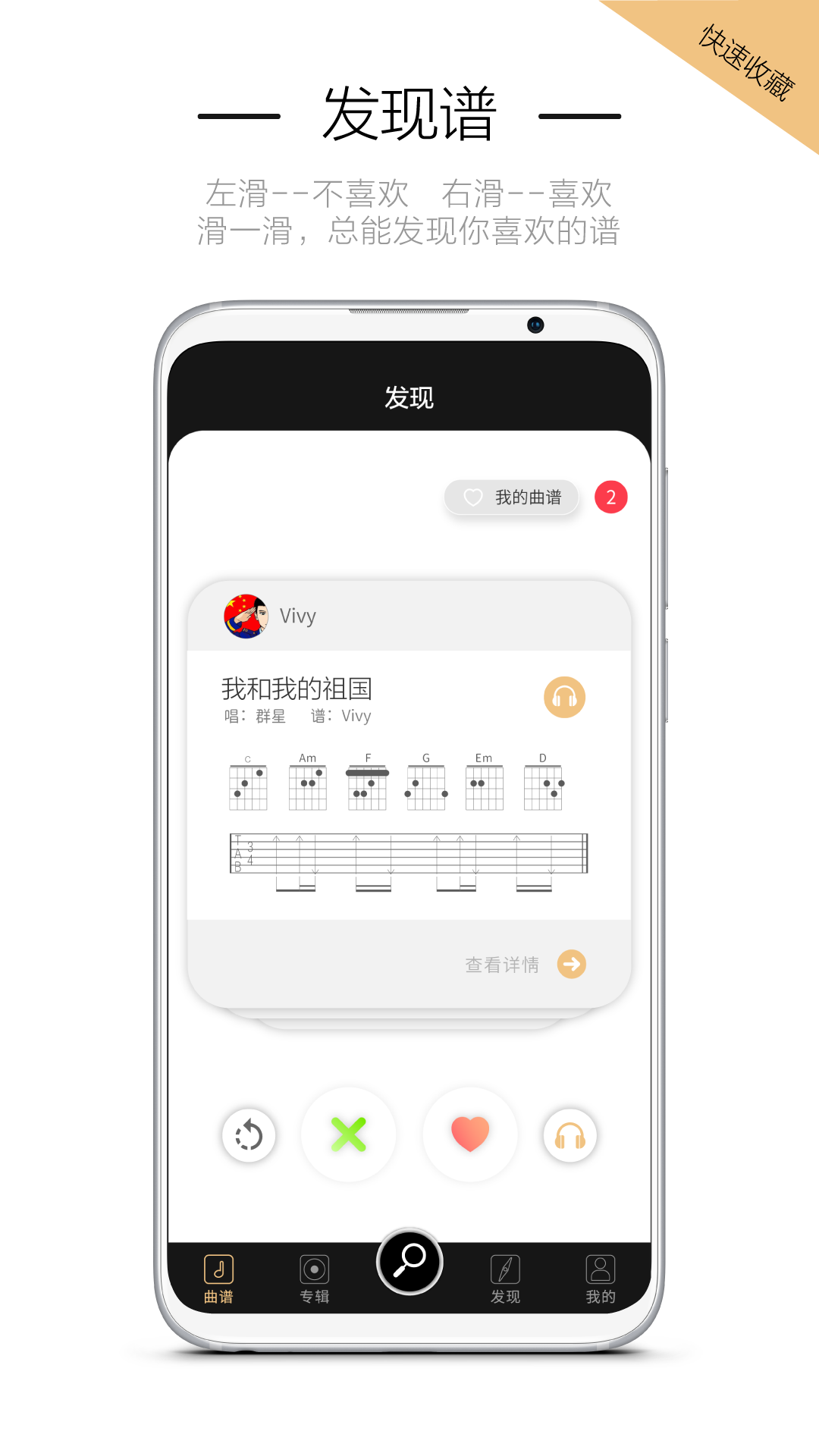 4、进入发现页面,就能对喜欢的曲谱进行右滑收藏