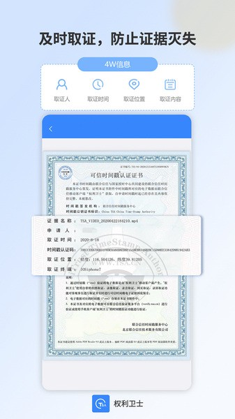 权利卫士是一款帮助用户保护证据有效性的手机应用。软件流程为用户上传文件Hash值到服务器进行时间戳认证,并不会上传文件内容,用户不必担心隐私泄露。软件中还提供多种取证方式,打开APP即可随时随地取证,让用户在取证-认证的流程中操作更加方便。经认证的文件将符合《电子签名法》中数据电文原件形式的要求,从而增加证据的效力,同时还支持证据管理,所有证据及其信息都可方便查看。