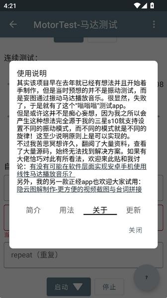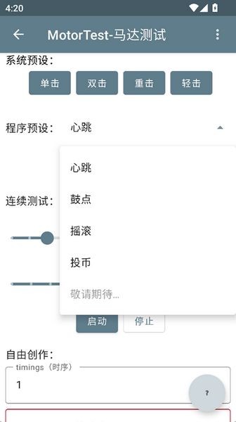 motortest马达是一款专门为安卓手机用混准备的马达振动测试软件,手机中是有马达的,而这款软件可以主动控制马达,你可以预设各种自己喜欢的振动频率,还可以改变闹钟的振动频率和振动规律,给你带来完全不一样的全新体验!