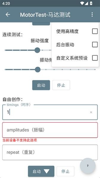 在该组测试,你可以自行指定振动强度和振动频率进行连续测试。