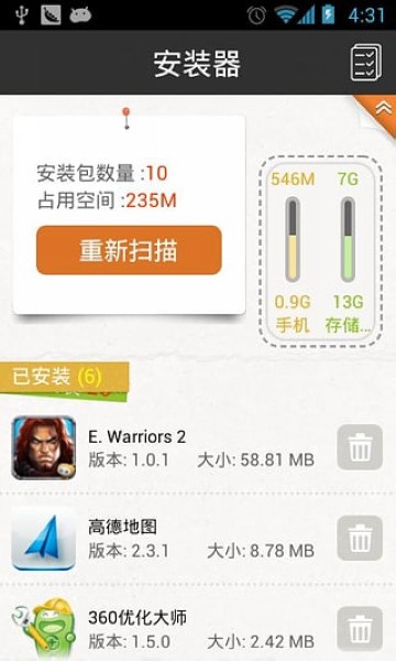 3、普通APK安装包扫描和管理功能,对SD卡和手机内存的APK安装包轻松实现安装和卸载功能, 让您一目了然知道手机内存空间的使用情况。