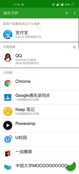 在选择了应用之后,回到主界面即可看到各个应用的休眠状态。