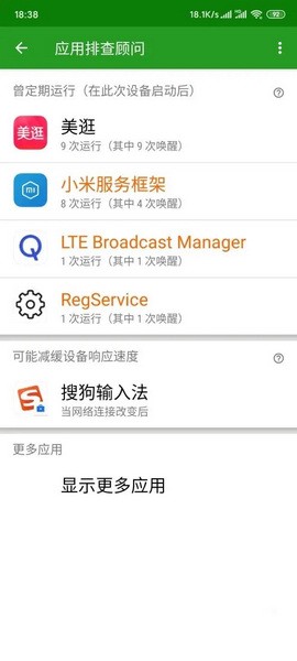 绿色守护还会统计应用的定期运行状况以及唤醒的次数,并将有这些行为的应用在「应用排查顾问」中显示出来,我们可以根据应用的类型(一般判定是否是微信等即时信息类应用)、唤醒次数等情况进行处理。