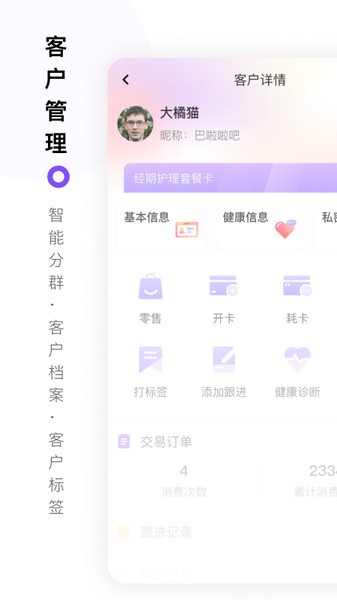1.顾问式成交 2.目标拆解 3.开单耗卡和充值(只是一个记录不涉及真正的支付) 4.客户管理 5.库存管理 6.经营数据分析