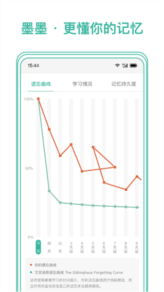 会根据个人的学习情况来生成对应的遗忘曲线,让你清楚的查看到具体的变化情况