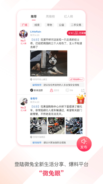 微兔gogo是一款主打便民生活服务的软件,专为贵州地区用户打造,界面简洁清爽,功能丰富强大,汇集海量本地新闻、生活资讯实时更新中,且资讯种类繁多,囊括趣事、美食、风景等应有尽有,当然,如果你有想要分享的内容,也可以创建并发布,通过精彩内容经营你的社交圈,让更多小伙伴认识你!此外,电视节目、直播等你来看,赶紧下载体验吧!