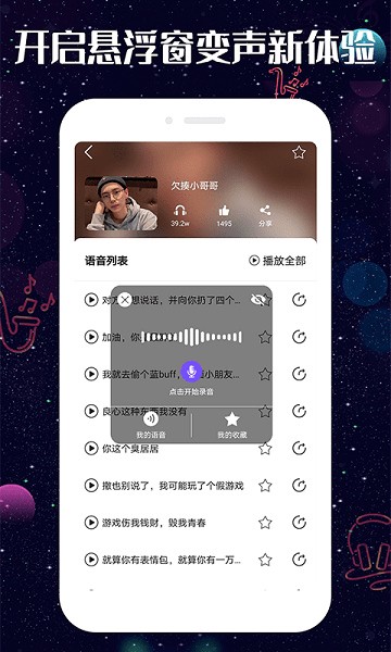 2、方便快捷的变声器,一键录音,一键秒变变音,多款音效,随意切换。