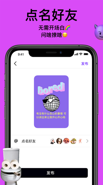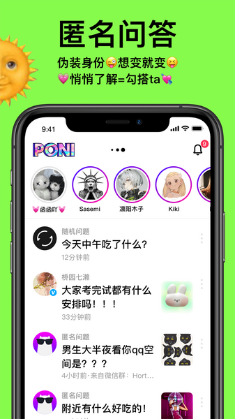 你是否也常常觉得自己找不到一个聊得来的朋友,是否觉得自己与其他人格格不入,是别人眼中的异类,是否觉得生活中的社交过于沉重,让自己小心翼翼的无法呼吸,那就快来PONI社区,这里对你的古怪照单全收。poni是一款专门为年轻人打造的社交平台,用户使用时,可以匿名或是提出古怪,奇特的问题,这里有各种天马行空的有趣问题和回答,人们在这里无需伪装个性,可以放心大胆的做自己,将自己脑海中的想到的尽情宣泄,这里是专属于怪小孩的隐秘角落。用户可以找到许多新的朋友,可以是同一个微信qq群,也可以是同用一个WiFi的人,甚至可以是擦肩而过的陌生人,形形色色的有趣灵魂,都在PONI等你。用户提出问题时,点开好友,无需开场白,即可发送,直接省去客套,进入有趣的互动,等待收获好友的回答。快来下载PONI,尽情的做自己吧!软件特色