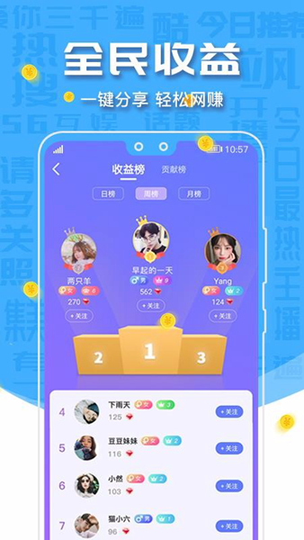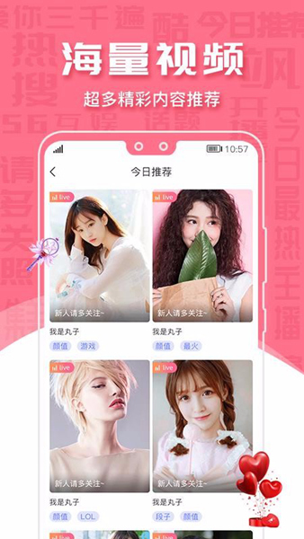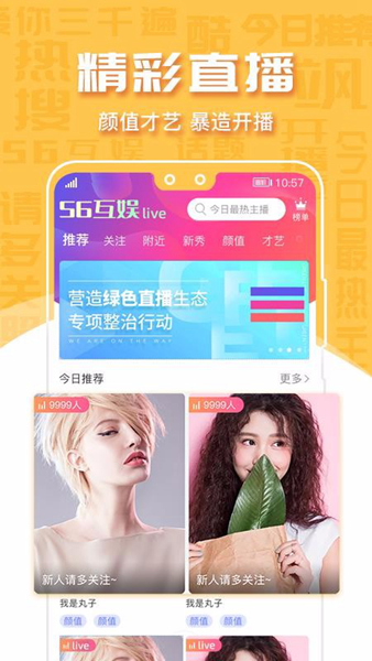 56互娱是一款主打直播社交的软件,其将直播和交友融为一体,在这里你不仅能看到高颜值主播带来的精彩才艺展现,还能实时和主播仅连麦互动,带你近距离接触心仪主播!同时软件还搭配了智能筛选系统,帮助用户快速寻找和自己志同道合的伙伴,且支持一对一聊天,若是感官不错,还能进行互相关注,以便下次继续畅聊,更过瘾!