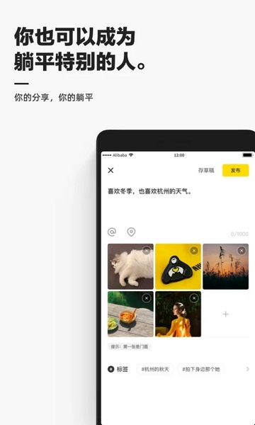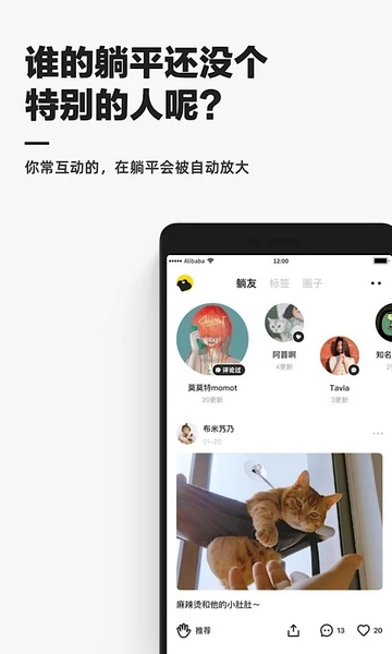 这款叫“躺平”的APP主要是用来分享生活趣事的平台,我觉得挺有意思的。里面有很多有趣的分类,像萌宠、美食、绘画这些都覆盖到了,而且用户们会分享自己的家居布置或者小动物,看起来特别温馨。软件的功能也挺多的,可以关注别人,看到他们更新还会提醒,还能评论互动,感觉很适合交朋友。