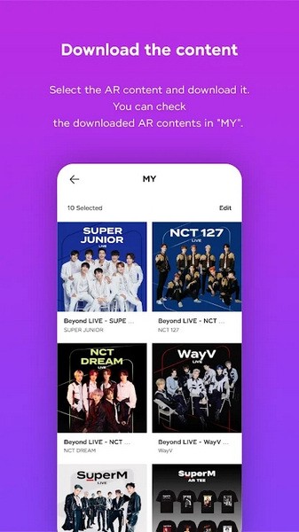 2、进入smtown ar app后,首先在app首先中找到你的已购买的专辑并点击下载,一直等到100%即代表下载完成