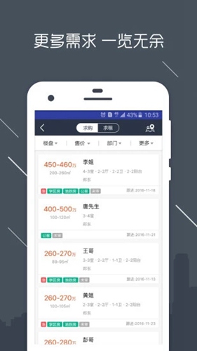 主要功能是查看房源、客源,跟进房客源、随时随地了解客户需求等。