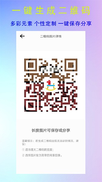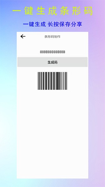 二维码生成识别app是一款免费的非常好用的手机二维码扫描和制作软件,软件内支持的项目非常多种,包括二维码扫描、条形码扫描、二维码制作和条形码制作等等,并且操作起来非常简单,只要大家属于自己想要表达的内容,都可以一键生成,并且用户们自己还可以手动修改二维码的颜色、大小等。条形码则可以帮助大家可以轻松查询网购商品的来源,获取商品的详细信息。