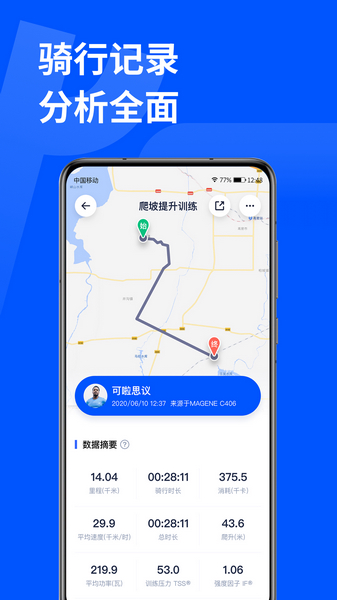 4、骑行和功率训练结束之后,您可以在平台内看到您本次骑行或者训练的数据分析,让您可以更加了解自身状态,科学提高自身水平。